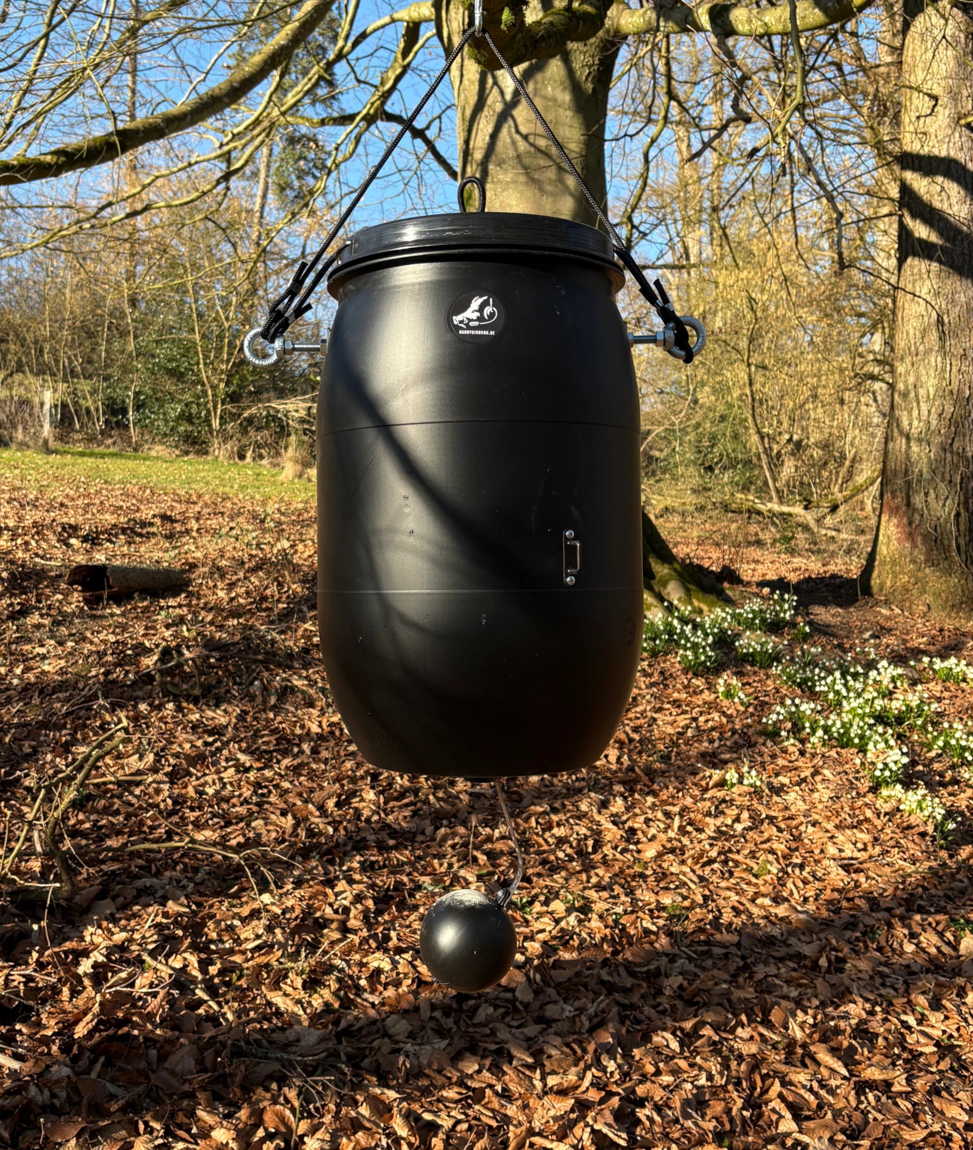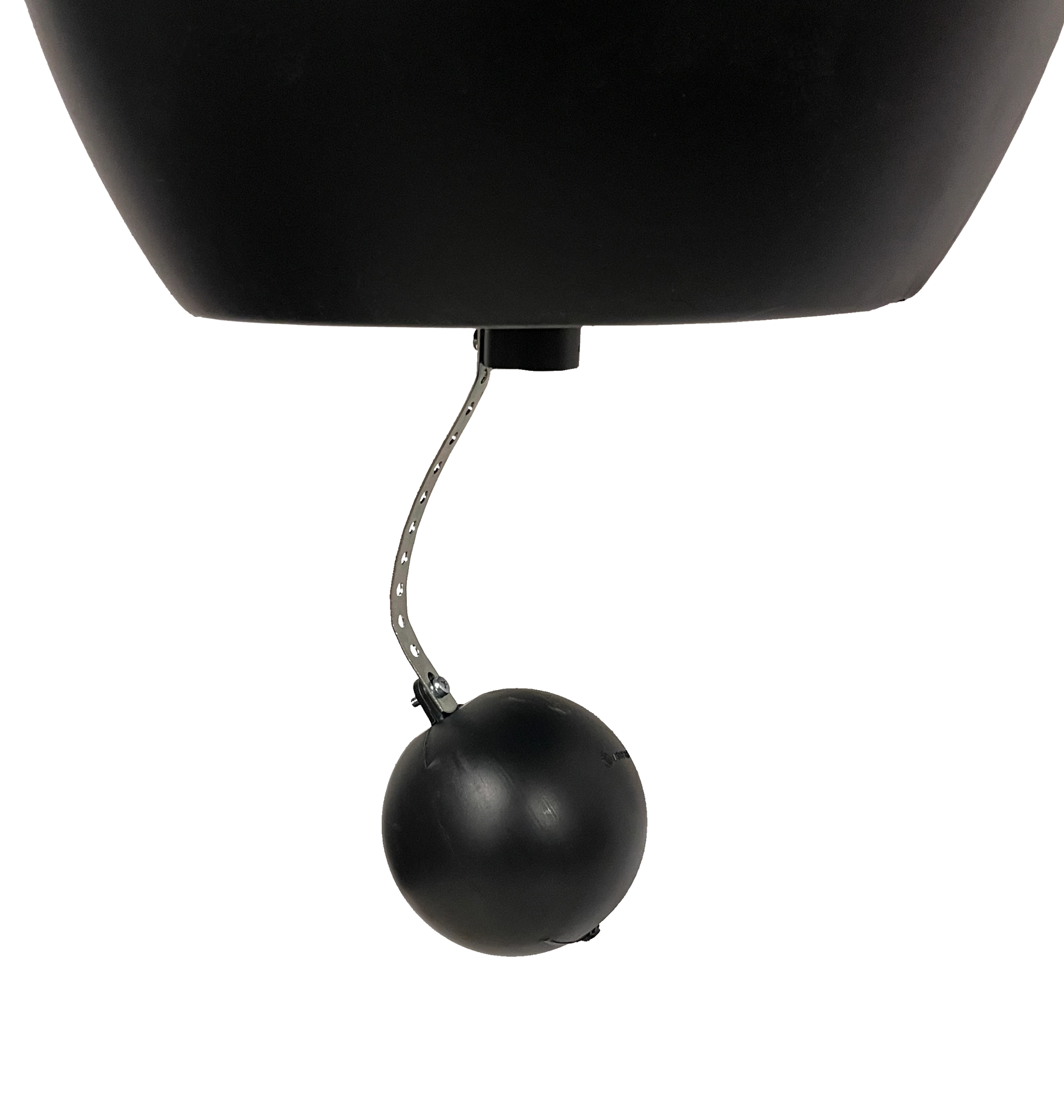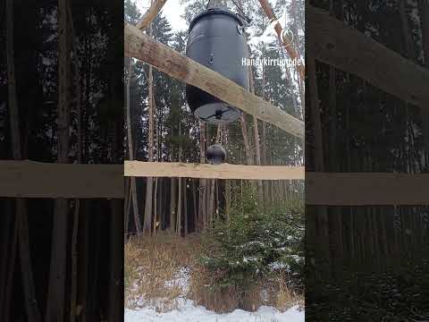 Die Verteilerkugel ermöglicht die breitwürfige Streuung des Kirrgutes. Das Kirrgut fällt auf die unter dem Auslass anhand eines Metallhalters ausgerichtete Kugel und springt in einem Radius von ein bis drei Metern ab. (Verteilradius abhängig von der Höhe der Aufhängung. Aus Gründen der besseren Sichtbarkeit wurde das Fass im Video nicht so hoch aufgehängt, dass die maximale Verteilung erreicht werden konnte.)
